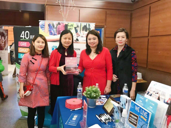 GNCA代表(下图左起)副主席张坚宣女士 Jane Zhang、冯婉婷女士 Dorothy Feng,以及韦珂女士 Ke Wei 特别莅临We-Education展区与我们的代表亲切合影。
